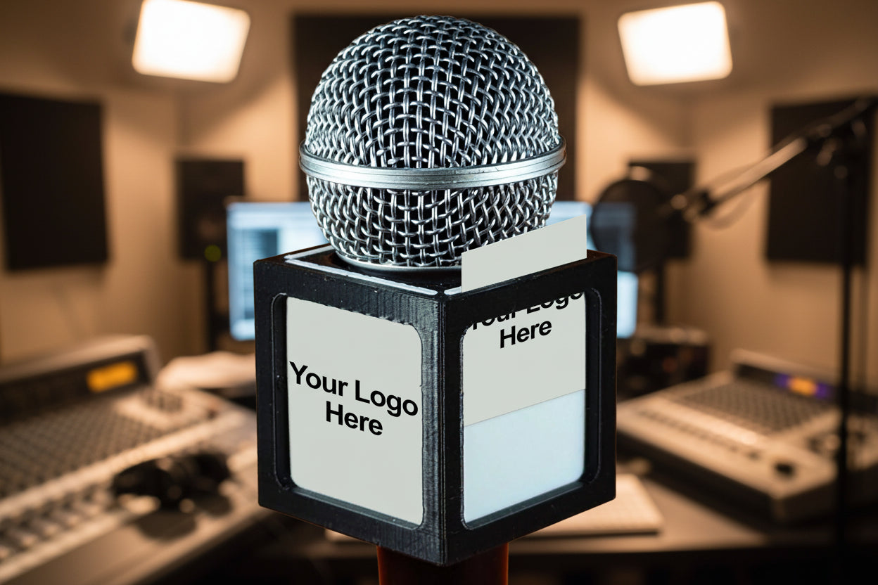 דגלי המיקרופון שלנו מעוצבים עם חריצים ייחודיים המאפשרים להכניס בקלות לוגו או מסר מודפס – ושומרים עליו יציב ובולט בכל צילום, ראיון, פודקאסט או שידור חי.