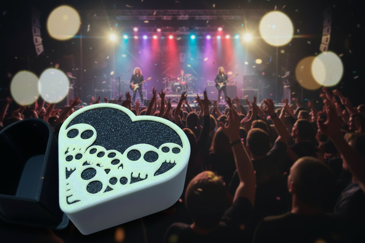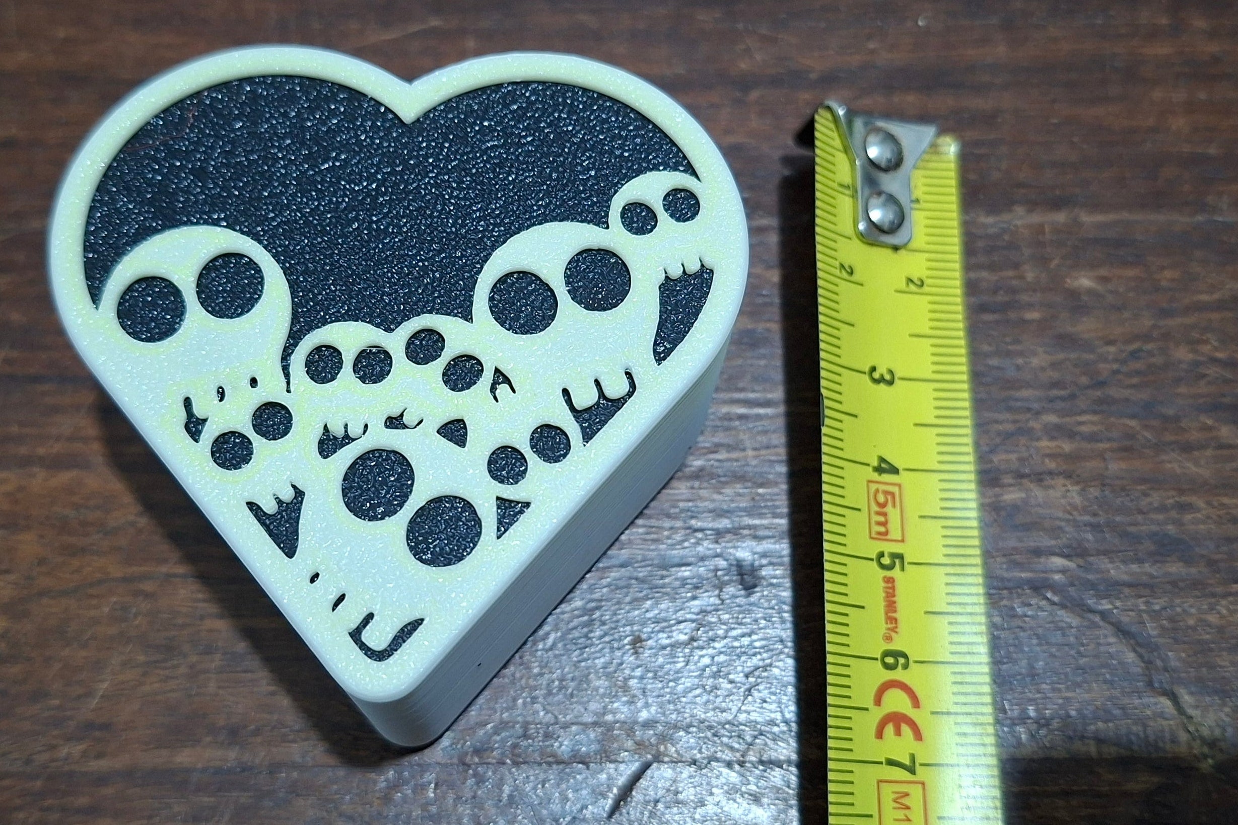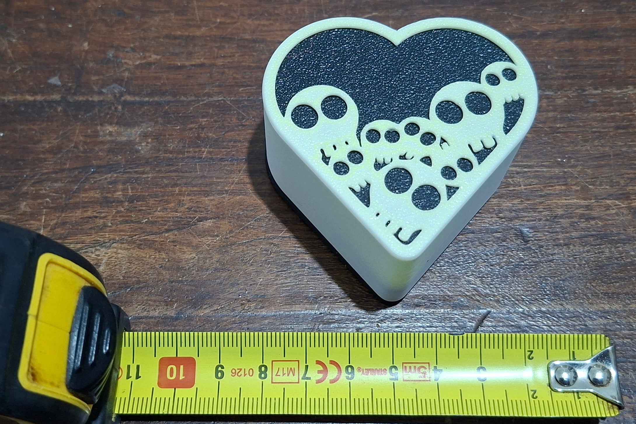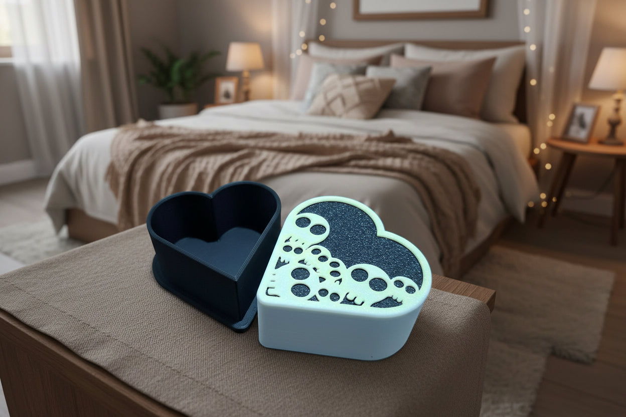 קופסה דקורטיבית בצורת לב עם מכסה מעוטר בגולגולות, מודפסת בהדפסת תלת־ממד מחומר PLA איכותי.