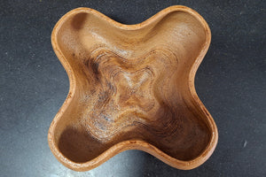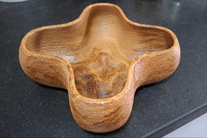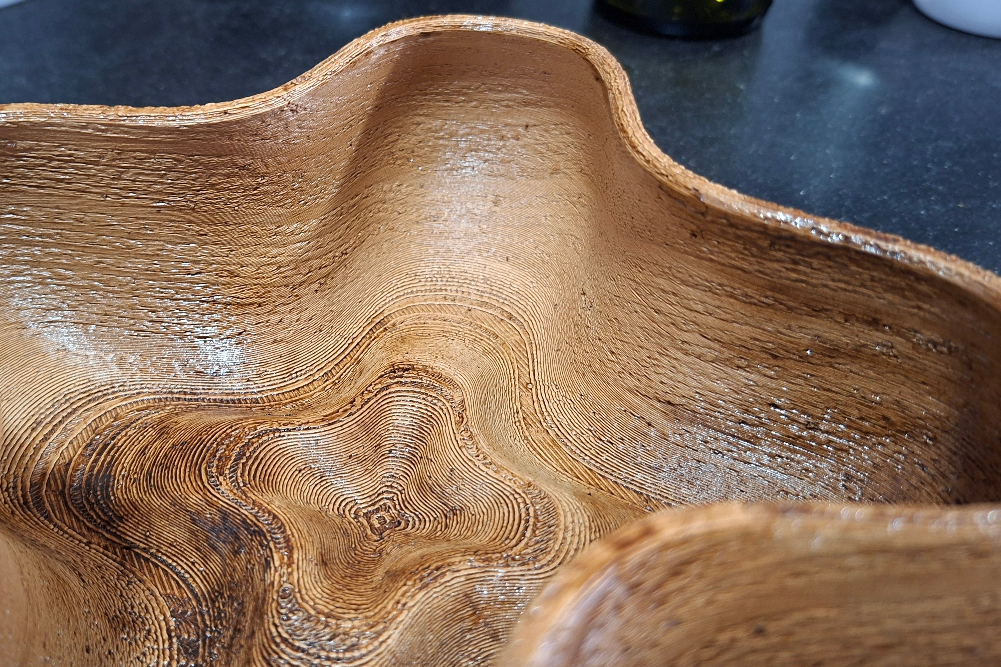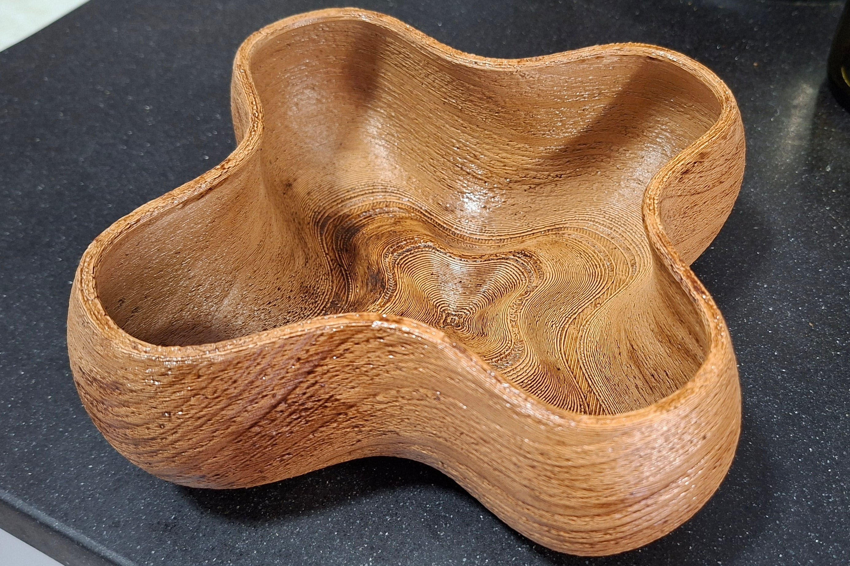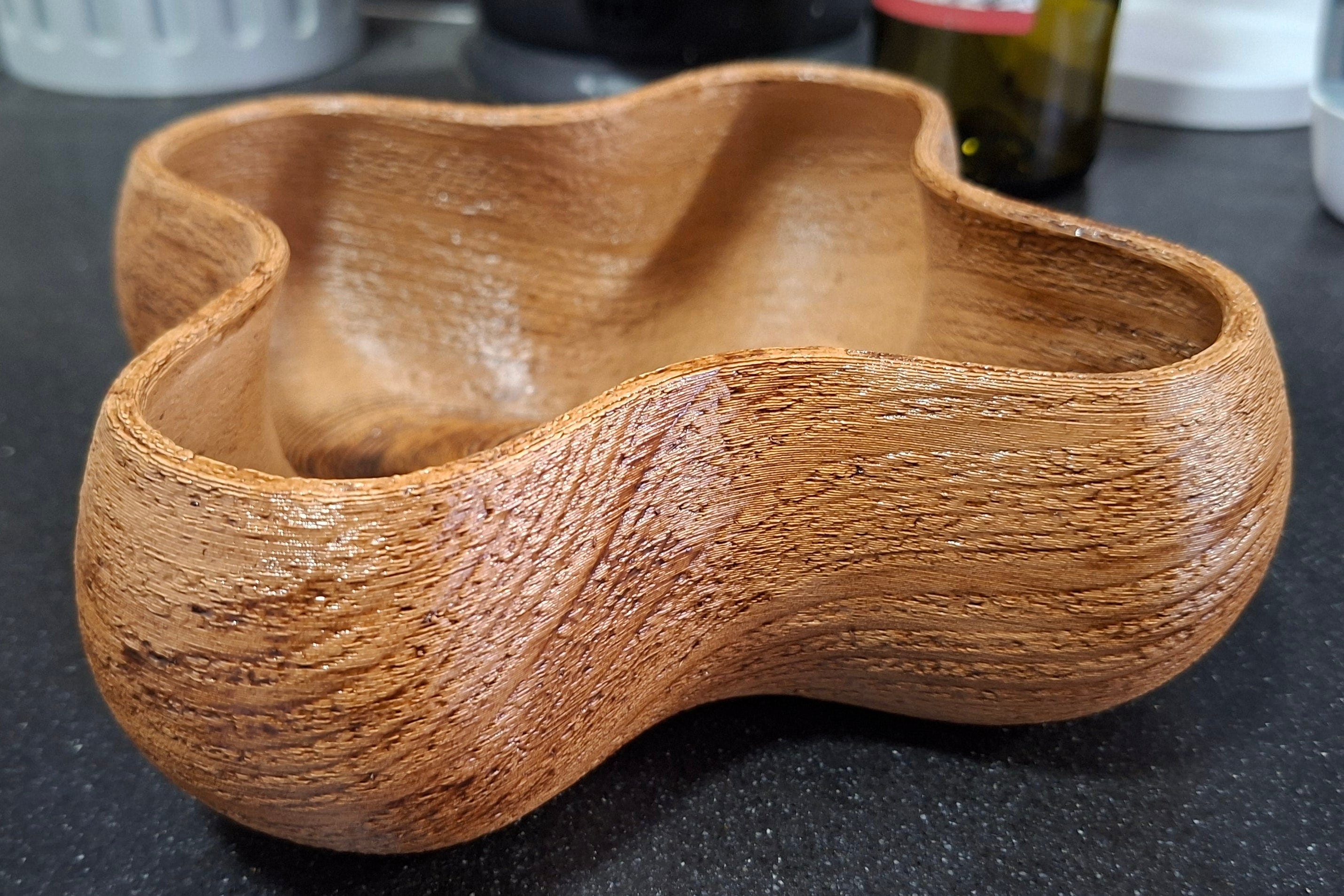 קערה ייחודית בעיצוב אורגני, מודפסת בתלת־ממד מחומר המשלב 40% שבבי עץ טבעי. לאחר ההדפסה הקערה צופתה בלכה להגנה ולמראה מבריק המבליט את טקסטורת העץ ומעניק תחושה טבעית וחמה. מתאימה כדקורציה לסלון, להגשת חטיפים יבשים, או כפריט עיצובי מודרני ומרשים