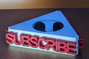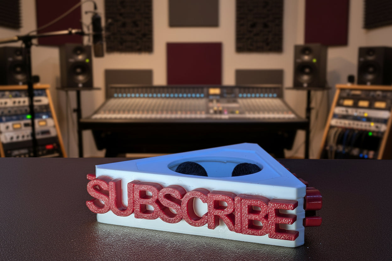 תבליט את הנוכחות שלך מול המצלמה עם דגל מיקרופון מושך תשומת לב, המעוצב עם כיתוב אדום ובולט: "SUBSCRIBE".